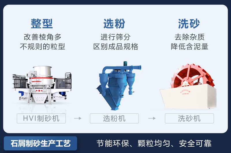 整型:被收集起來的石屑由輸送機(jī)運(yùn)到石料整形機(jī)(沖擊式制砂機(jī)、重錘式破碎機(jī)等)處先進(jìn)行深加工,改善棱角多、不規(guī)則的粒型;