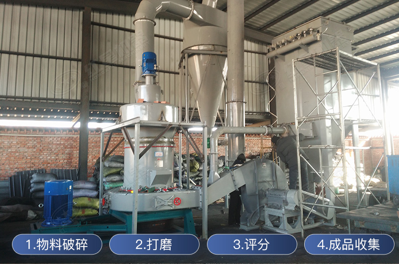 第二階段打磨:破碎后的方解石小塊由提升機(jī)送至儲(chǔ)料斗,再由給料機(jī)送至磨機(jī)研磨室進(jìn)行研磨。