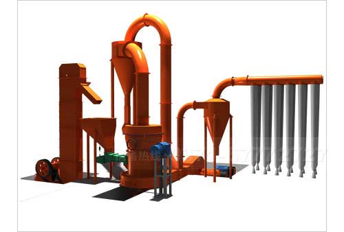 經(jīng)破碎工序后形成的小顆粒由提升機(jī)送入儲料倉,電磁振動給料機(jī)將物料均勻的送到上轉(zhuǎn)盤的中部,石灰?guī)r物料在離心力的作用下散向圓周邊,并落入磨環(huán)的滾道內(nèi)被環(huán)輥沖壓、滾碾、研磨而粉碎,石灰?guī)r物料經(jīng)第一層粉碎后落入第二層及第三層,高壓離心風(fēng)機(jī)的抽吸作用將外部空氣吸入機(jī)內(nèi),并經(jīng)過第三層粉碎后的粗粉帶入選粉機(jī)內(nèi)。選粉機(jī)內(nèi)旋轉(zhuǎn)的渦輪使粗顆粒物料回落重磨,細(xì)粉則隨氣流進(jìn)入旋風(fēng)集粉器并由其下部的卸料閥排出即為成品,而帶有少量細(xì)粉塵的氣流則經(jīng)過脈沖除塵器凈化后通過風(fēng)機(jī)和消聲器排出。