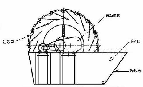 輪斗式洗砂機工作時電機通過三角帶、減速機、齒輪減速后帶動葉輪緩慢轉(zhuǎn)動,砂石有給料槽進入洗槽中,在葉輪的帶動下翻滾,并互相研磨,出去覆蓋砂石表面的雜質(zhì),同時破碎包覆砂粒的水汽層,以利于脫水;同時加水,形成強大水流,及時將雜質(zhì)及比重小的異物帶走,并從溢出口洗槽排出,完成清洗作用。 干凈的砂石油葉片帶走,最后砂石從旋轉(zhuǎn)的葉輪倒入出料槽,完成砂石的清洗作用。